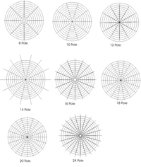 Einige Grundsätze:Je weniger Pole der Motor im Verhältnis zu den Statornuten hat, umso höher dreht er. (kleinere Luftschraube erforderlich) Das Verhältnis Magnetpole - Statornuten sollte nicht größer oder kleiner 1:1,5 sein. (gut z.B. 9N12P , schlecht 9N16P) Auch bei weniger Windungen pro Zahn dreht der Motor schneller als bei vielen Windungen. Der Wickelraum sollte soweit als möglich ausgenutzt werden. Wenn nicht mehr Windungen gewünscht sind, evtl dickeren Draht nehmen, das reduziert die Verluste in den Kupferwindungen Die Wicklungen können zum Schluß in Stern- (Y) oder Dreieckschaltung verlötet werden. Bei gleicher Leistung müsste die Dreieckschaltung 1,73 mal mehr Windungen als die Sternschaltung haben. Da man sich die gewünschte Motorleistung vorher überlegen sollte, kann man Stern o. Dreieckschaltung wahlweise nehmen und sich nur von Praktischen überlegungen leiten lassen (viele Windungen dünner Draht, oder wenig Wd. dicker Draht). Bei der Auswahl der Magnetmaße sollte man 1. auf eine ausreichende Abdeckung achten,d.h. das über 65% des Stators Magnete gegenüberstehen. Abdeckungen über 85% bringen nichts mehr an Leistung, können aber in seltenen Fällen den Regler aus dem Tritt bringen. 2. sollte der Luftspalt zwischen Magnete und Glocke möglichst klein sein, Die Magnete möglichst dick. 3. wenn die Magnete bei der gewünschten breite und dickte nicht passen, kann man auch 2 oder mehrere Magnete in gleicher Richtung als einen Pol nebeneinader kleben ( kaskadieren). Dadurch ändert sich auch der Luftspalt, d????? ???G??k???k?¾a die Glockenrundung besser ausgenutzt wird. Bevor man die Magnete einklebt, sollte die Glocke gut von innen gereinigt u angeschliffen sein. Spätestens jetzt muß man auch gewünschte Lüftungslöcher in die Glocke bohren. Nicht zuviele, dann wird die Glocke instabil. Anschließen alles gut entgraten, besonders von innen. So kann man z.B. den Borhdurchmesser für die Lüftungslöcher anzeichnen.