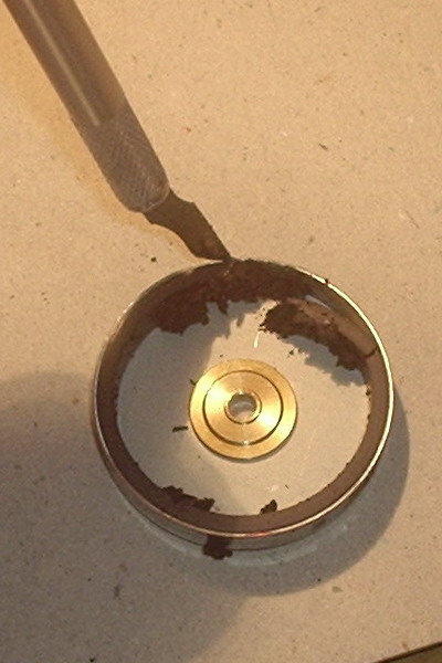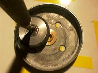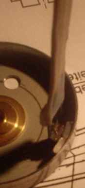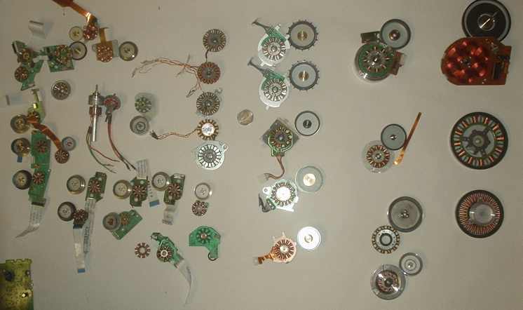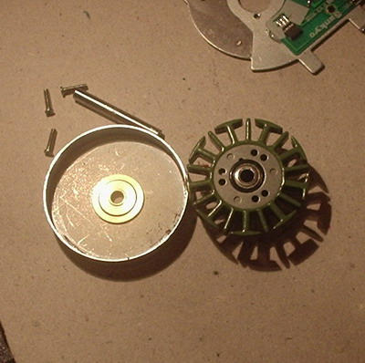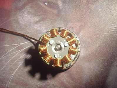 Wenn die Motoren kleiner sein sollen, kann man auch CD oder DVD-Laufwerke verwenden, auch in Festplatten, Videorekordern und einigen anderen Geräten findet man mit viel Glück brauchbares Ausgangsmaterial. Nach Ausbau des Motors muß man meist zuerst eine Andruckro????? ???G??k???k?¾lle von der Achse lösen. Dazu benutzt man entweder einen passenden Abzieher, oder man benutzt den Schraubstock und schlägt die Welle vorsichtig heraus. Bei allen Arbeiten muß man darauf achten, das die Motorglocke nicht verbogen wird. Das nächste Problem ist das herausziehen der Achse mitsamt Glocke. Oft kann man durch einen leichten Hammerschlag von hinten auf die Achse beides lösen, manchmal muss man erst Sicherungsringe entfernen. Zuviel Gewaltanwendung zerstört dabei wahrscheinlich die Kugellager. ( In manchen Streamerlaufwerken findet man in einer zusätzlichen Andruckrolle noch 2 weitere passende Lager). Wenn die Glocke sich nicht leicht lösen läßt, kann man die komplette Achse im Schraubstock herausdrücken. Auspressen der Welle: hinter die Achslagerung legt man z. B. einen Stecknuss passenden Durchmessers, dann wird von der Anderen Seite ein Stahlstift o. Schraube o.ä. benutzt um die Welle auszupressen Wenn wir die Laufwerksteile dann getrennt haben, sehen wir endlich welches Schätzchen wir vor uns haben. Streamer gibt es mit 9 Nuten, 9Nuten mit Hilfnuten, 12 Nuten und 18 Nuten. Alle sind einigermaßen brauchbar, Die Abmessungen variieren dabei. MagnetringDie nächste Aufgabe ist das entfernen des Original Magnetringes. Die Motoren würden zwar auch damit laufen, aber je nachdem welches Magnetmaterial verbaut wurde, wird nicht der von uns gewünschte Wirkungsgrad erreicht. Ist der Magnetring weich, lässt er sich durch einschneiden an einer Stelle nach innen mit dem Messer wegdrücken. In schwierigen Fällen kann man den Heißluftföhn benutzen oder die Glocke einige Stunden in Aceton einlegen. Danach müsste der Magnetring auch lösbar sein. Bei hartem Magnetmaterial hilft es auch, eine Stelle mit der Dremel bis zum Blech abzufräsen. Den Rest kann man dann mit dem Cuttermesser abhebeln. . StatorDer Stator ist normalerweise mit drei 2mm Schrauben mit der Grundplatte und dem Lagerträger verschraubt. In einigen Fällen ist der Lagerträger nur aus Kunststoff und mit dem Stator und der Grundplatte verschmolzen, dann muss man die Kunstoffnippel abschneiden und hinterher 2mm Bohrungen anbringen. Die Originalwicklung ist für unsere Zwecke auch nicht zu gebrauchen und muss entfernt werden. Entweder in der richtigen Reihenfolge abwickeln, oder alles mit dem Cuttermesser vorsichtig durchschneiden.