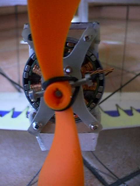 ZusammenbauWenn die Windungen keinen Kuzschluß untereinander und zum Stator haben, kann der Motor zusammengebaut werden. Eine neue Achse kann man mit dem Schraubstock einpressen. Vorsichtig und nur mit Gegenlager. Anschließend mit Loctide sichern. Falls die Kugellager zu stramm auf der Welle sitzen, kann man diese mit 400er Schmirkel in der Bohrmaschine leicht abschleifen. Falls man nicht die original Rückplatte als Motorträger benutzen will, kann man aus Alu, Platinenmaterial, o. 2mm Sperrholz einen Träger bauen, auf dem dann mit 2mm Schrauben der Stator mit Lagerträger geschraubt wird. Nach dem Zusammenstecken darf im Motor nichts schleifen. Wenn die Wicklungen an der Glocke schleifen, kann man mit einem kleinen Röhrchen z.B. von einer Teleskopantenne für Abstand sorgen. Die Magnete dürfen nicht am Stator schleifen, notfalls Magnet säubern, neu einkleben oder Stator abschleifen. Schleifarbeiten an Magnetmaterial sind mit Vorsicht anzugehen, bei hohen Temperaturen werden sie unbrauchbar. Falls die Magnete minimal zu dick sind, sollte man vor dem Einkleben höchstens die Ecken abrunden. Den Dittomotor kann man vor oder hinter dem Motorspannt montieren, Bei Hinterspanntmontage ist keine Sicherung der Glocke notwendig. Bei Vorspanntmontage kann man einen Stellring auf den hinteren Achsstummel schrauben. Beim anschließenden Probelauf des Motors für gute Befestigung sorgen. Niemals den Motor mit Propeller einfach in der Hand halten. Wenn alles gut passt, kann man mit einem Streamerumbau Wirkungsgrade bis zu 75%, tlw. 80% erreichen. Bei den Leistungen die wird fordern sind 60-65% eta im Arbeitspunkt aber durchaus normal. Am wohlsten fühlt sich der Stremermotor bei Eingangsleistungen um 100W bei höherer Spannung z.B. 4Z Lipoly auch 150W bei brauchbaren Wirkungsgraden. Entscheidend für den Wirkungsgrad sind:
